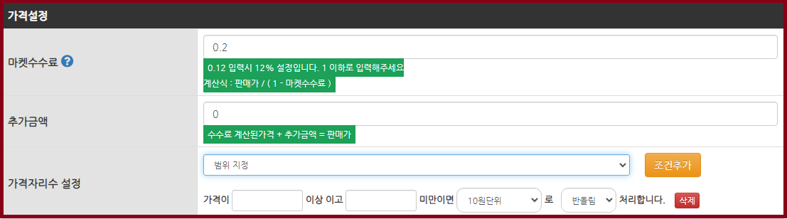 - - 마켓수수료까지 계산된 가격에서 해당 마켓에서만 추가적으로 받기 원하시는 금액을 입력해 주시면 됩니다.