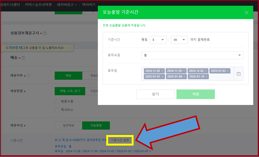 - - [오늘출발]로 선택하는 경우 [스마트스토어센터 > 상품관리 > 상품등록 > 배송 > 배송속성 > 오늘출발]에서 [기준시간 설정]을 해 주셔야 합니다.