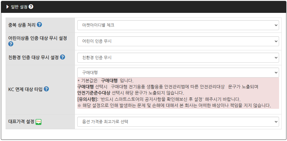 일반설정은 스마트스토어에 전송할 때 공통으로 적용되는 설정입니다.