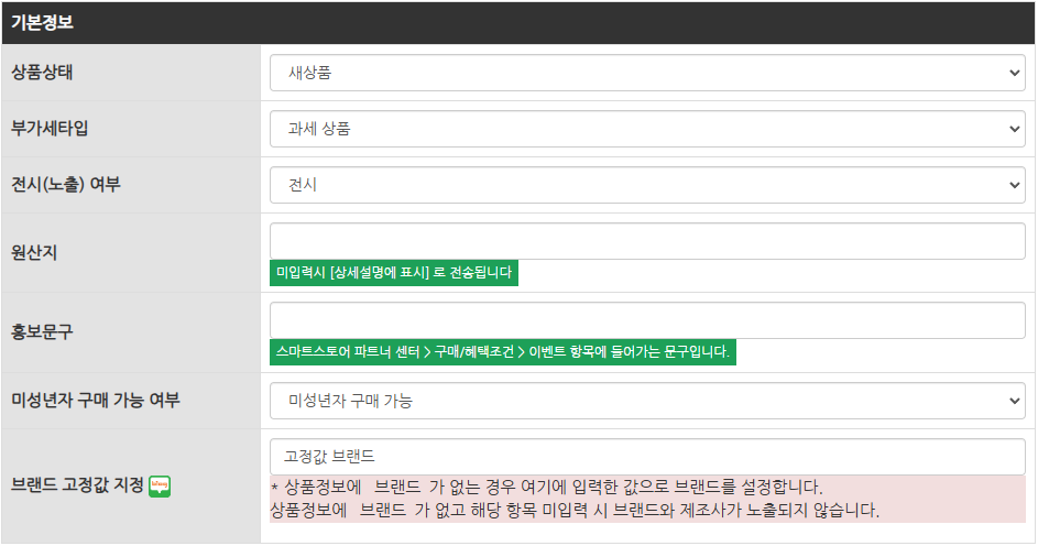 - - 수집한 `브랜드`상품정보가 없고 이 항목도 입력되지 않았다면 스마트스토어로 전송시에 브랜드와 제조사정보가 노출되지 않습니다.