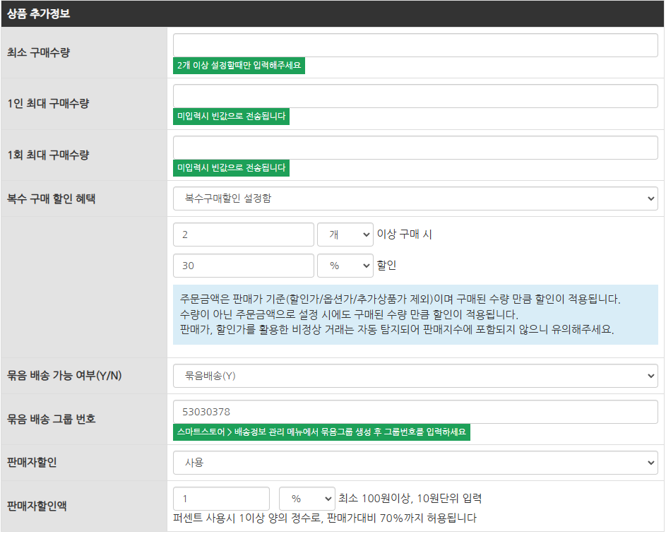 - - 스마트스토어 > 배송정보 관리 메뉴에서 묶음그룹 생성 후 그룹번호를 입력하세요