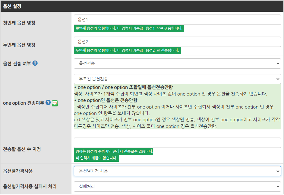 - - 색상/사이즈 조합이 one option / one option 인 경우 그대로 보낼지 옵션을 안보낼지 설정합니다.