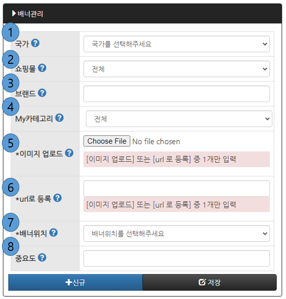 - * 배너관리 : [*] 표시가 있는 항목은 필수 항목이며, 그외의 [국가, 쇼핑몰, 브랜드]등은 입력조건을 위한 옵션 항목입니다.