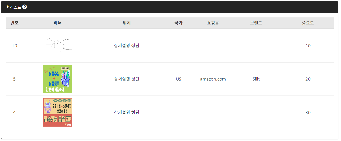 - - 배너 관리 항목을 통해 생성한 리스트를 확인할 수 있습니다.