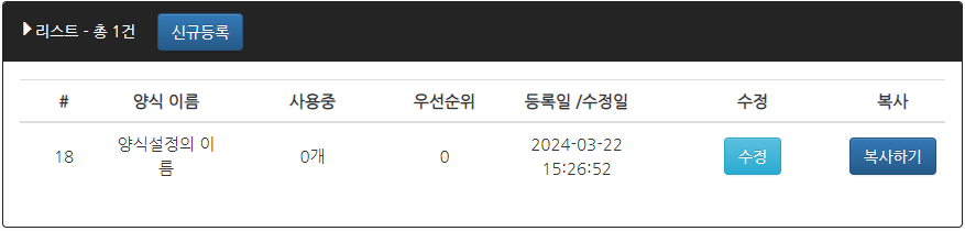 - - 양식 등록 후 등록한 것을 이용하여 새로 등록하고 싶을 떄 복사하기를 누르면 해당 설정의 내용들이 미리 셋팅 되어 있는 신규 등록 페이지로 이동합니다.