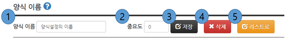 - ④ 삭제 : [수정]할 경우에만 노출되는 버튼입니다. 확인절차 없이 양식이 바로 삭제되니 주의 바랍니다.