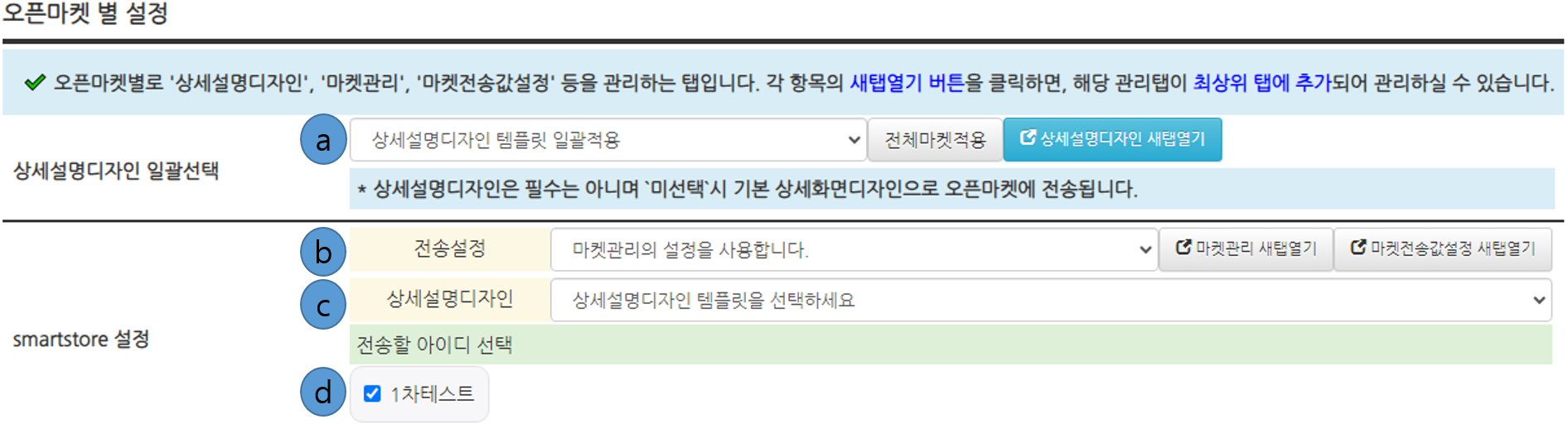 - ⓒ 상세설명디자인 : 생성해 두신 상세설명디자인이 있다면 각 오픈마켓별로 선택하실 수 있습니다.